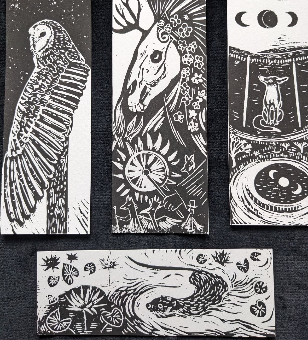 The set of Hookland bookmarks you will receive consists of 4 different handprinted bookmarks